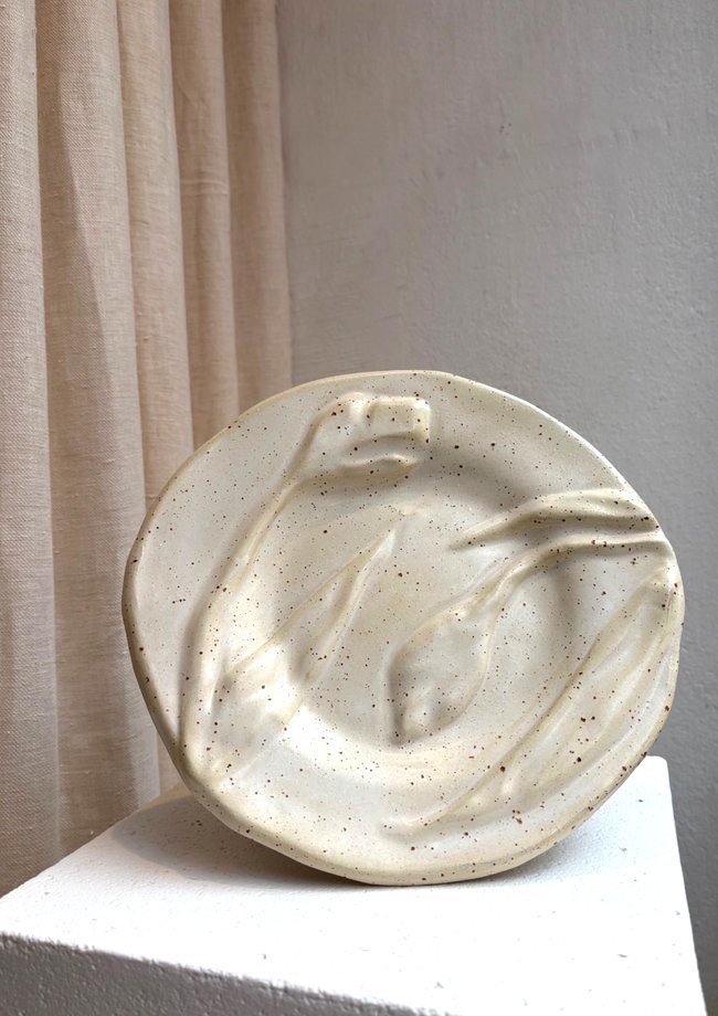 Handgjord tallrik i ljus stengodslera med relief glaserad i crème matt glasyr på prickig stengodslera. Eftersom all vår keramik görs för hand i ateljén förekommer variationer och varje objekt är därför unikt. Denna modell finns i 2 exemplar men görs även på beställning samt i andra glasyrer. Maila förfrågan till ateljepalsund@gmail.com